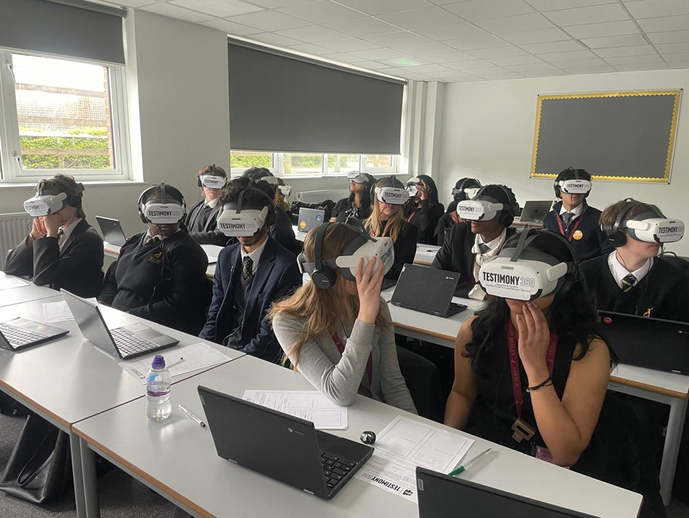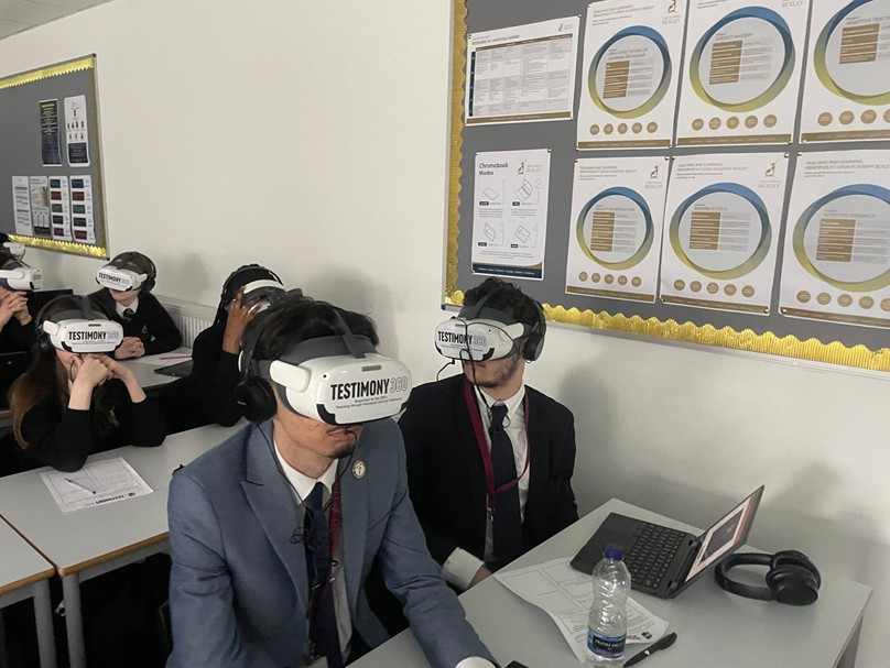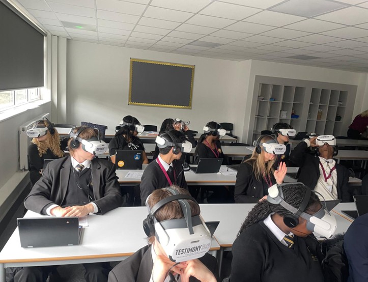 In addition, students experienced Virtual Reality (VR) exploration. Wearing VR headsets, they were able to “visit” significant locations mentioned in the survivor’s story, such as concentration camps and childhood homes. This immersive, 360-degree experience helped students connect deeply with the testimony and better understand the historical context.